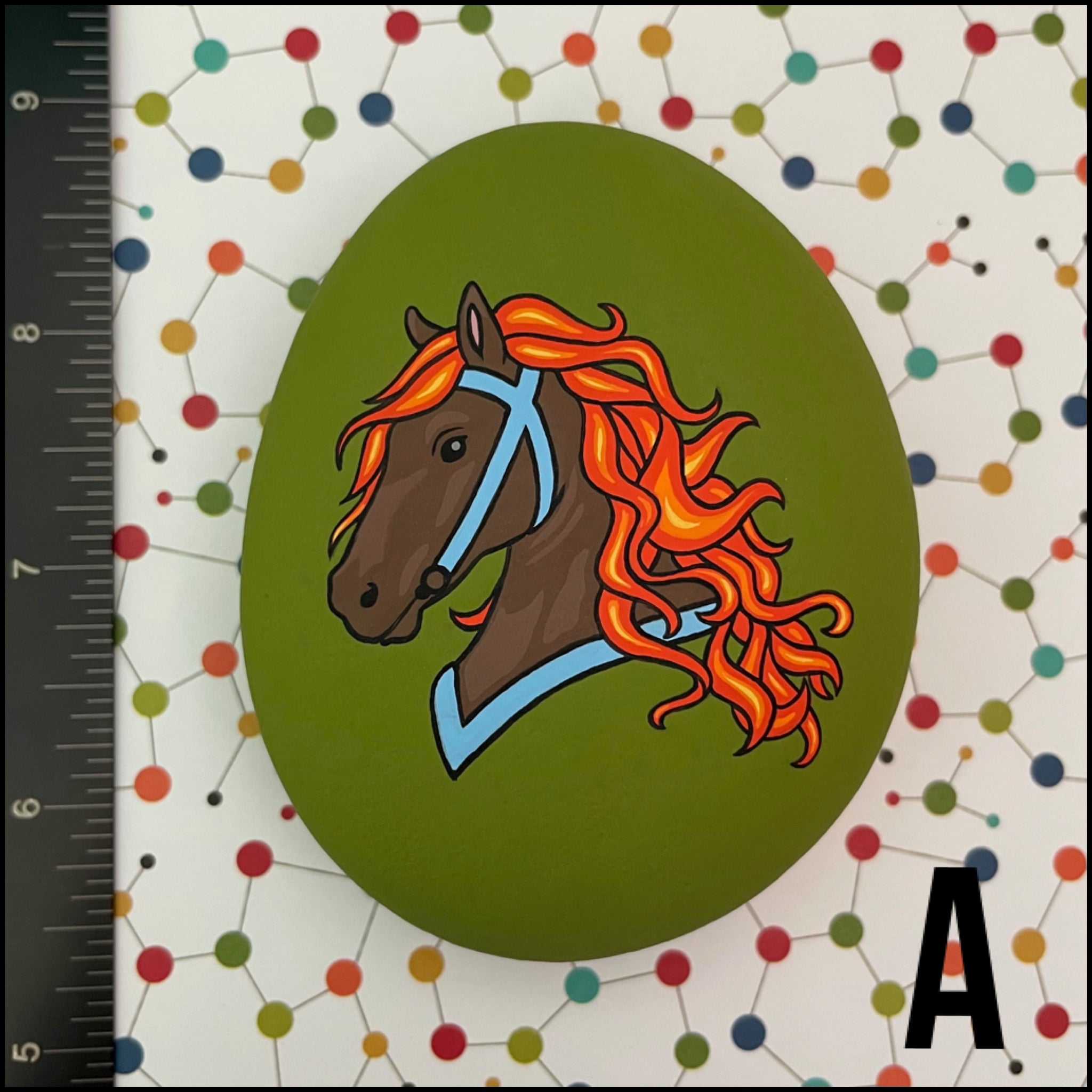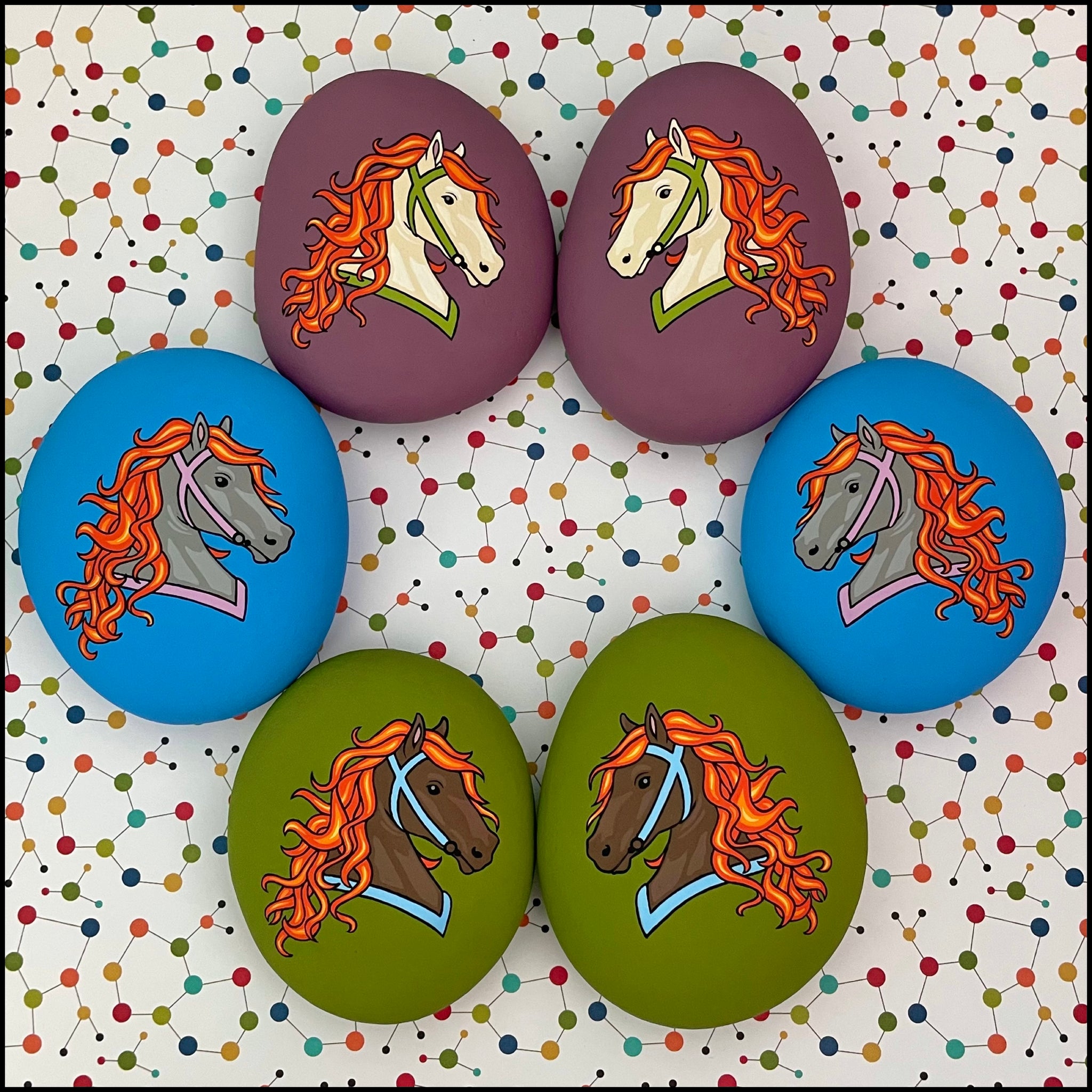 This design was created to celebrate the beginning of the Year of the Fire Horse, 2026. Each rock features a bright-eyed horse with a flowing mane of flames.